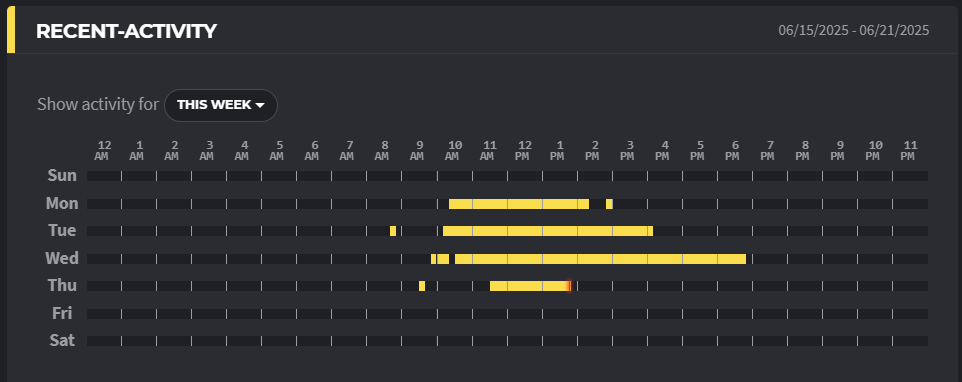 When you select any of these weeks, the table highlights the time slots when the cam model was online in yellow. Hover over any yellow slot, and you’ll see the exact duration the model streamed during that segment.