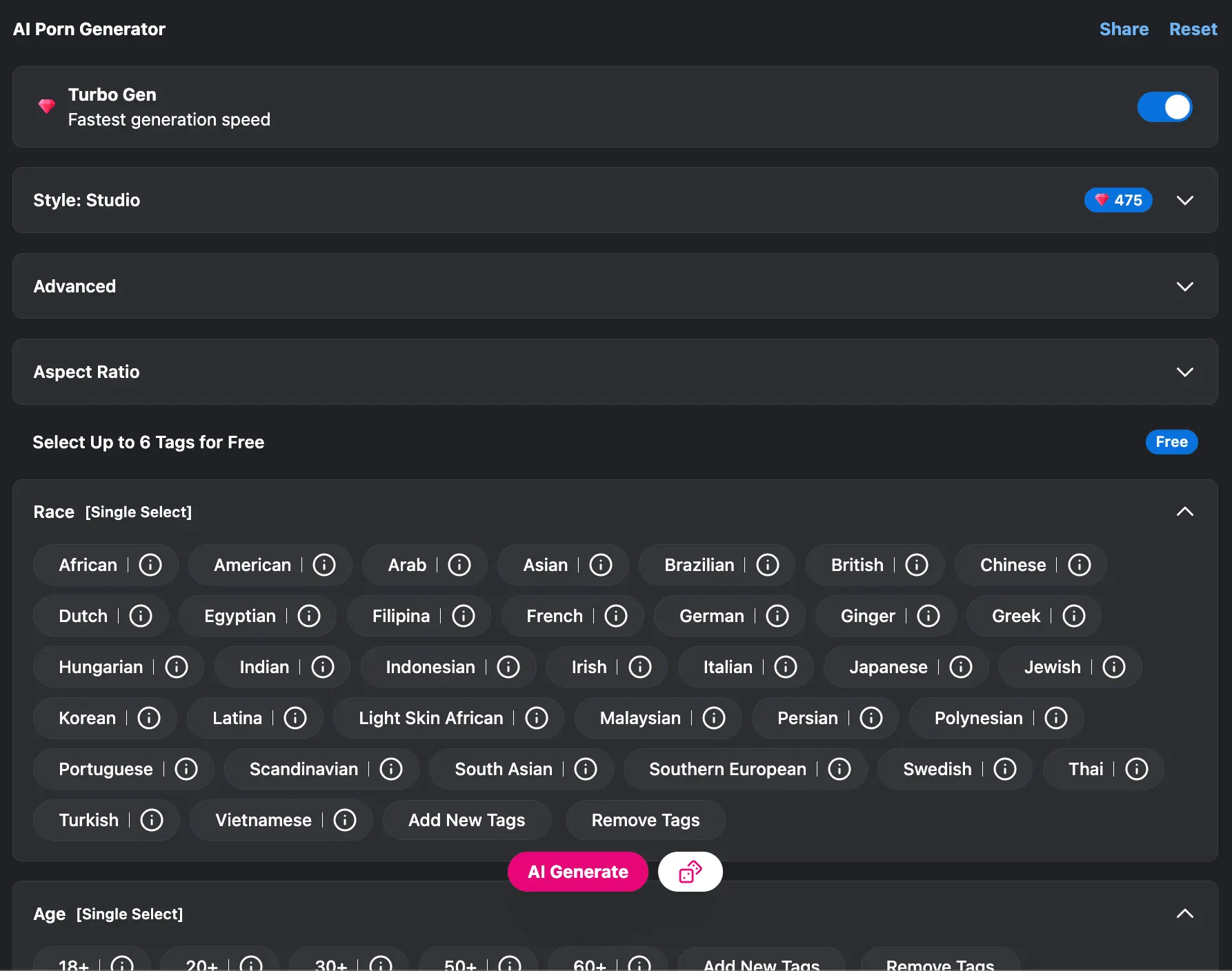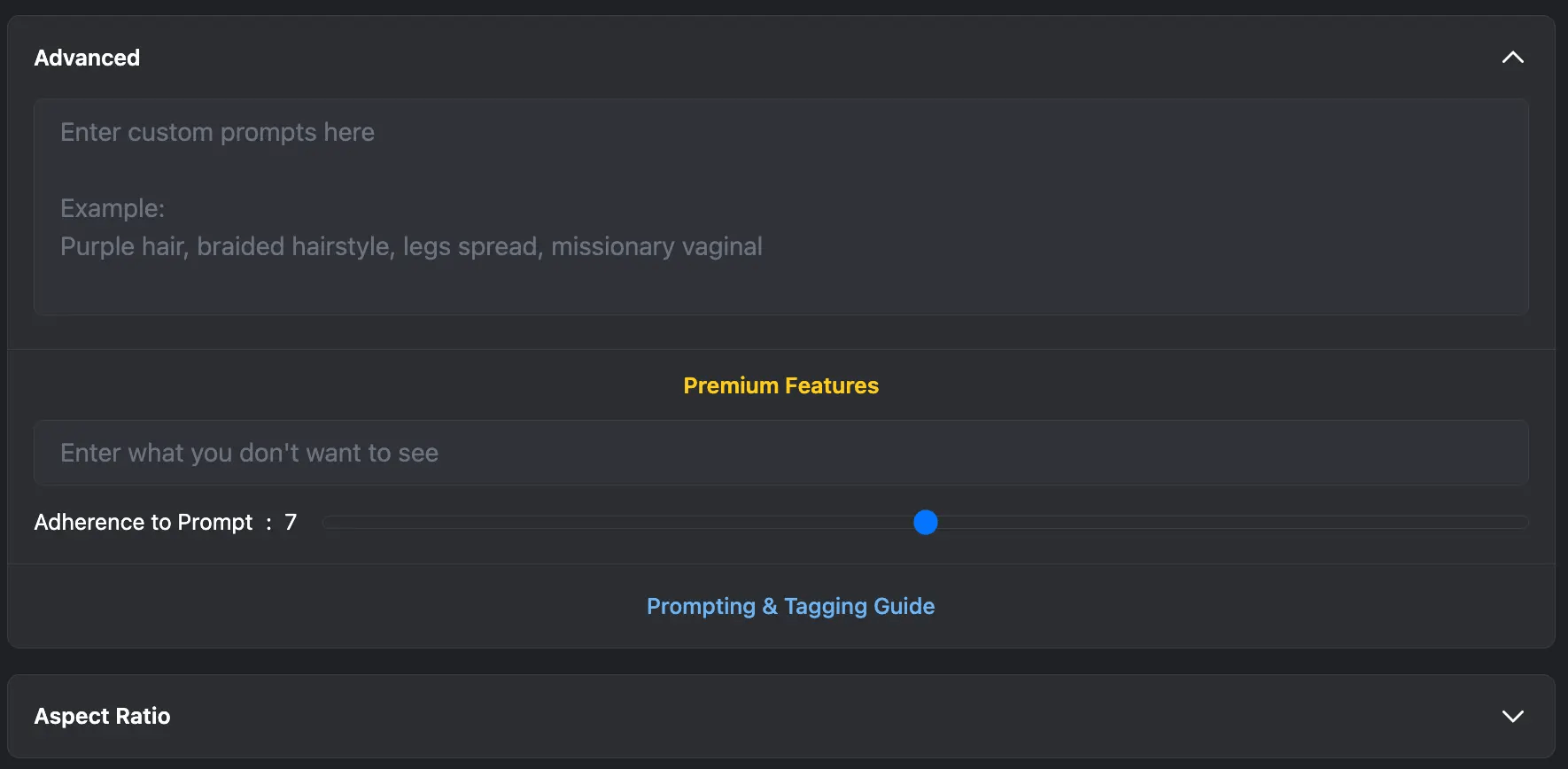 Tags are a crucial element in tailoring your AI Porn creation. Choose relevant Tags to define the theme and content of your desired scene. Whether it's specific characters, settings, or actions, these Tags guide the AI to generate content that aligns with your vision.
